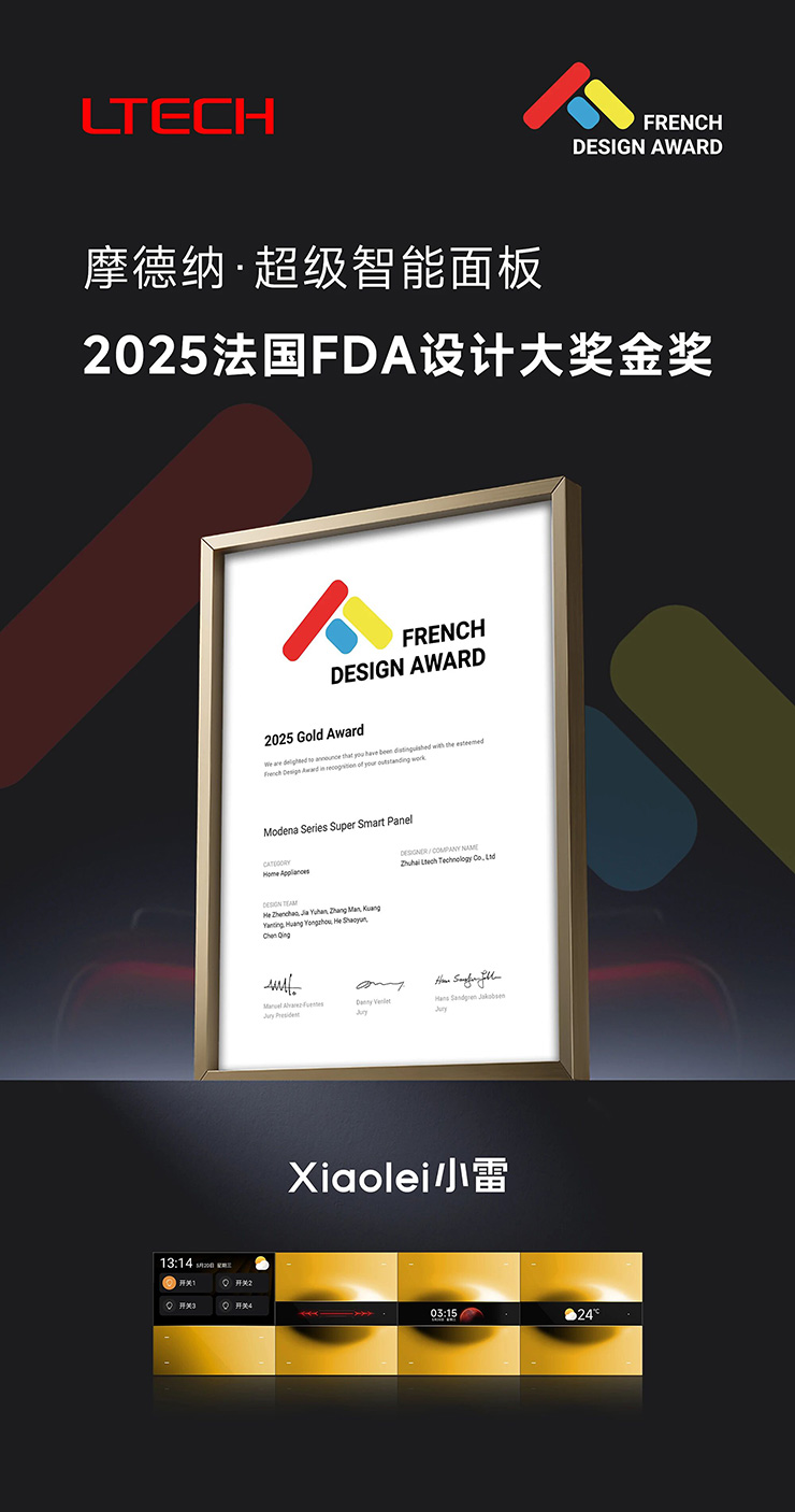 小雷智能家居重塑智能生活的美学定义!摩德纳・超级智能面板系列凭借突破性的设计理念与卓越的产品实力,一举斩获法国设计大奖(FDA)金奖!法国设计奖由国际设计奖协会(IAA,International Awards Association)创立于法国,由全球顶尖设计专家组成的评审团严苛评选,作为一项享有盛誉的全球盛事,法国设计奖吸引了全球和各行业的领先品牌,其中包括财富500强企业及行业巨头。